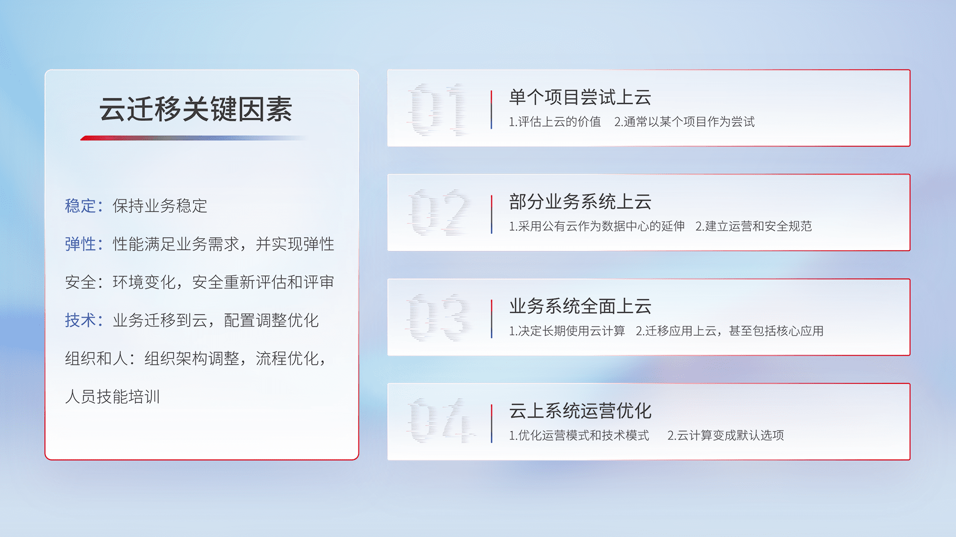 结合实际业务,,,,从规划设计、、、云平台选型、、、、云原生改造、、数据迁移、、、集成交付,,,迁移全过程为客户识别最佳上云路径,,做好风险识别管理,,,设计网络架构、、、、身份权限、、、、安全审计合规、、、操作审计、、日志审计、、监控告警策略、、多站点容灾设计等,,,,对云上基础设施进行整体规划,,,,提升IT治理水平,,,,以满足弹性、、高可用、、、高性能的需求。。。。